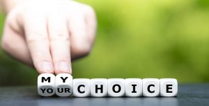 Hand turns dice and changes the expression “your choice” to “my choice”.